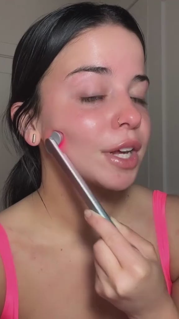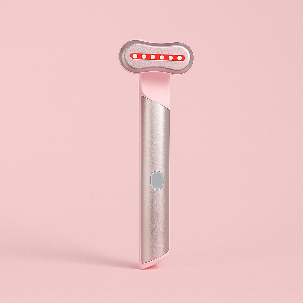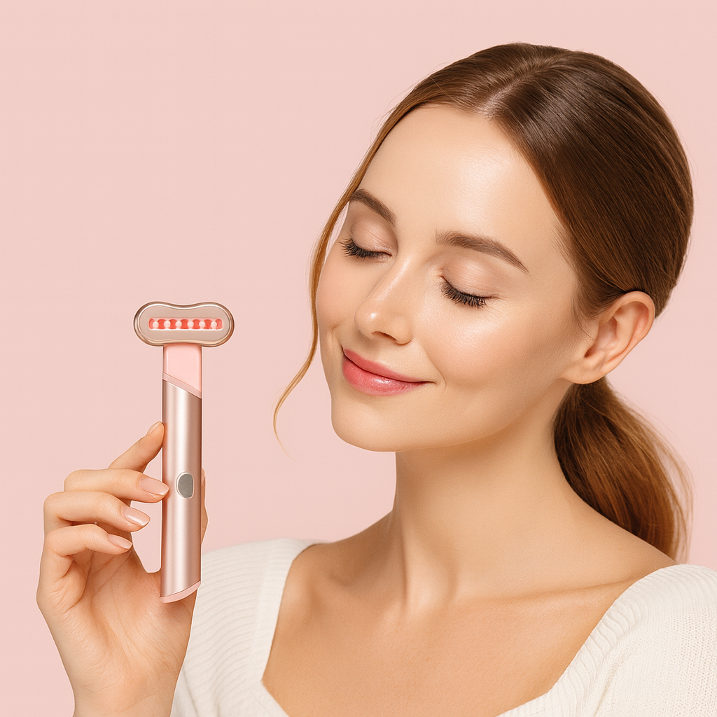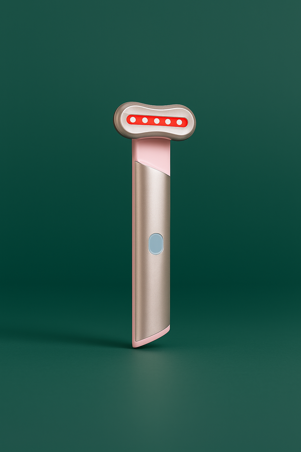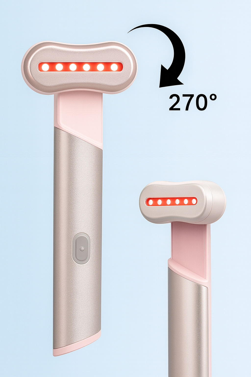 Компактният LED стик за красота комбинира топлина, вибрации и светлинна терапия, за да възстанови свежия и младежки вид на кожата. Най-често се използва около очите, където LED светлината и нежният масаж подобряват кръвообращението и стимулират регенерацията на клетките.